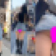 公衆の面前で肌も露わなミニスカートの中を覗き見るローアングルからのパンチラ。